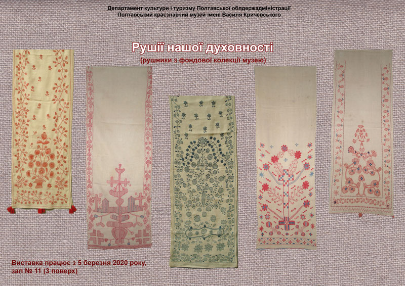 З 5 березня 2020 року у залі 11 (3-й поверх) працює виставка, на якій представлена колекція рушників, зібраних Іваном Зарецьким, Костем Мощенком, Данилом Щербаківським, що датується кінцем ХVІІІ – початком ХХ століття. Саме грандіозна збиральницька робота згаданих музейників дала можливість дослідити особливості орнаменту рушників Полтавського регіону. В основному, це речі з типовим полтавським орнаментом у вигляді "дерева життя" в різних варіаціях. Символіка рушників увібрала в себе матеріальну і духовну сторону життя наших далеких предків. Рушник є знаковою, символічною деталлю побуту українців. Його присутність простежується у всіх значних подіях життєдіяльності, святах і обрядах.