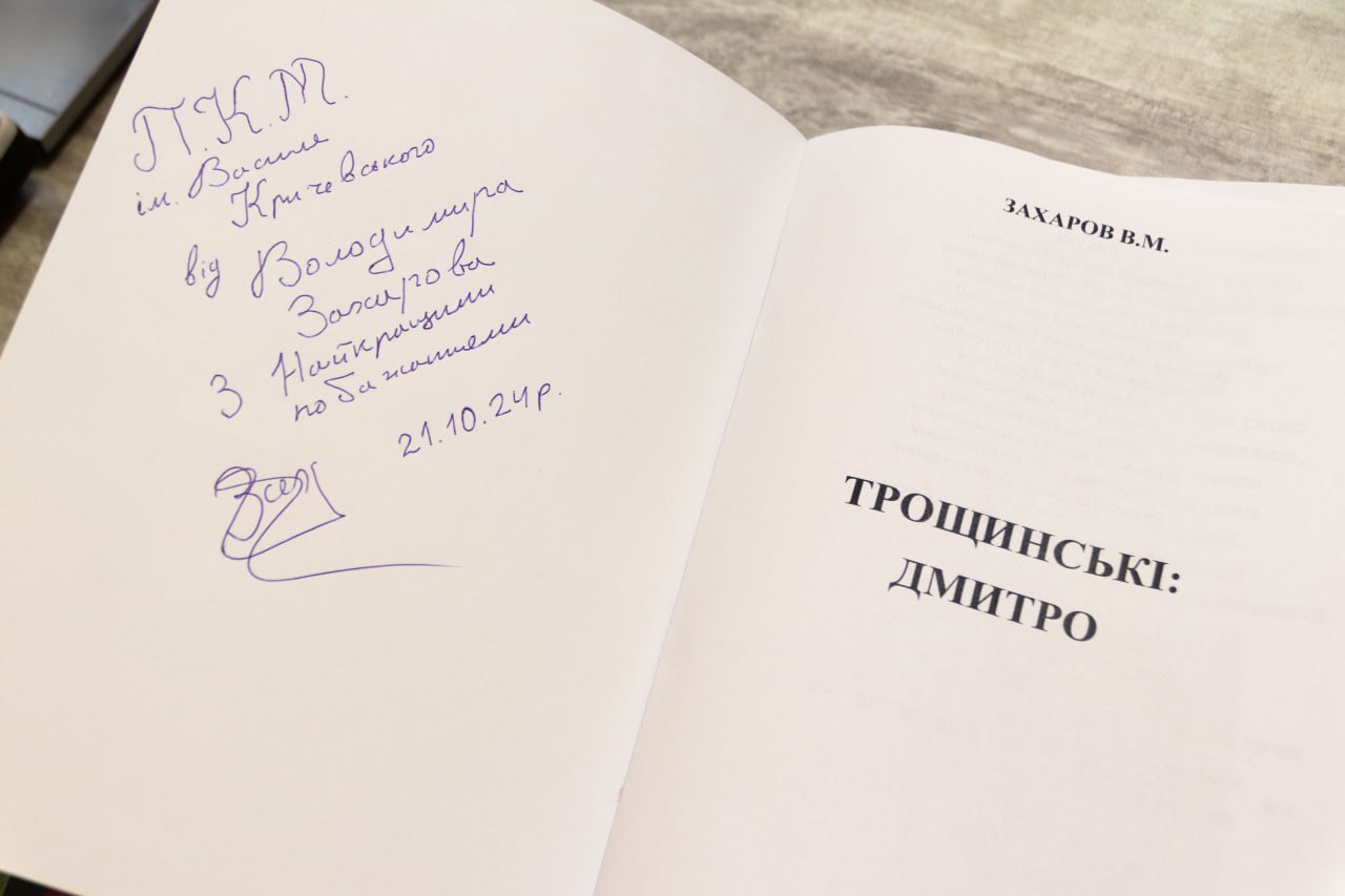 Свою щойно видану книгу "Трощинські: Дмитро" подарував музею його друг, краєзнавець Володимир Захаров. Монографія на 688 сторінок продовжує серію досліджень автора про впливову аристократичну родину Трощинських - представників дворянської еліти козацько-старшинського походження (раніше вже побачили світ "Трощинські: витоки' (2021) і "Трощинські: Гоголіана" (2023)). На початку книги автор висловив подяку науковцям, які надавали йому допомогу і підтримку, серед них і заступник директора з наукової роботи Полтавського краєзнавчого музею імені Василя Кричевського Володимир Мокляк.