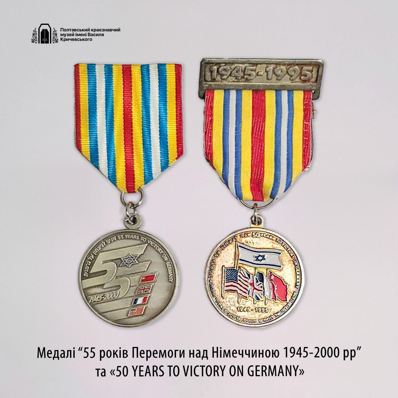Ювілейна медаль «50 YEARS TO VICTORY ON GERMANY» присвячена перемозі у Другій світовій війні. Її поверхню прикрашають зображення прапорів країн Західної Європи (Великої Британії, Держави словенців, хорватів, сербів), Ізраїлю, Сполучених Штатів, Радянського Союзу. Написи на івриті та англійською з датами «1939-1945».