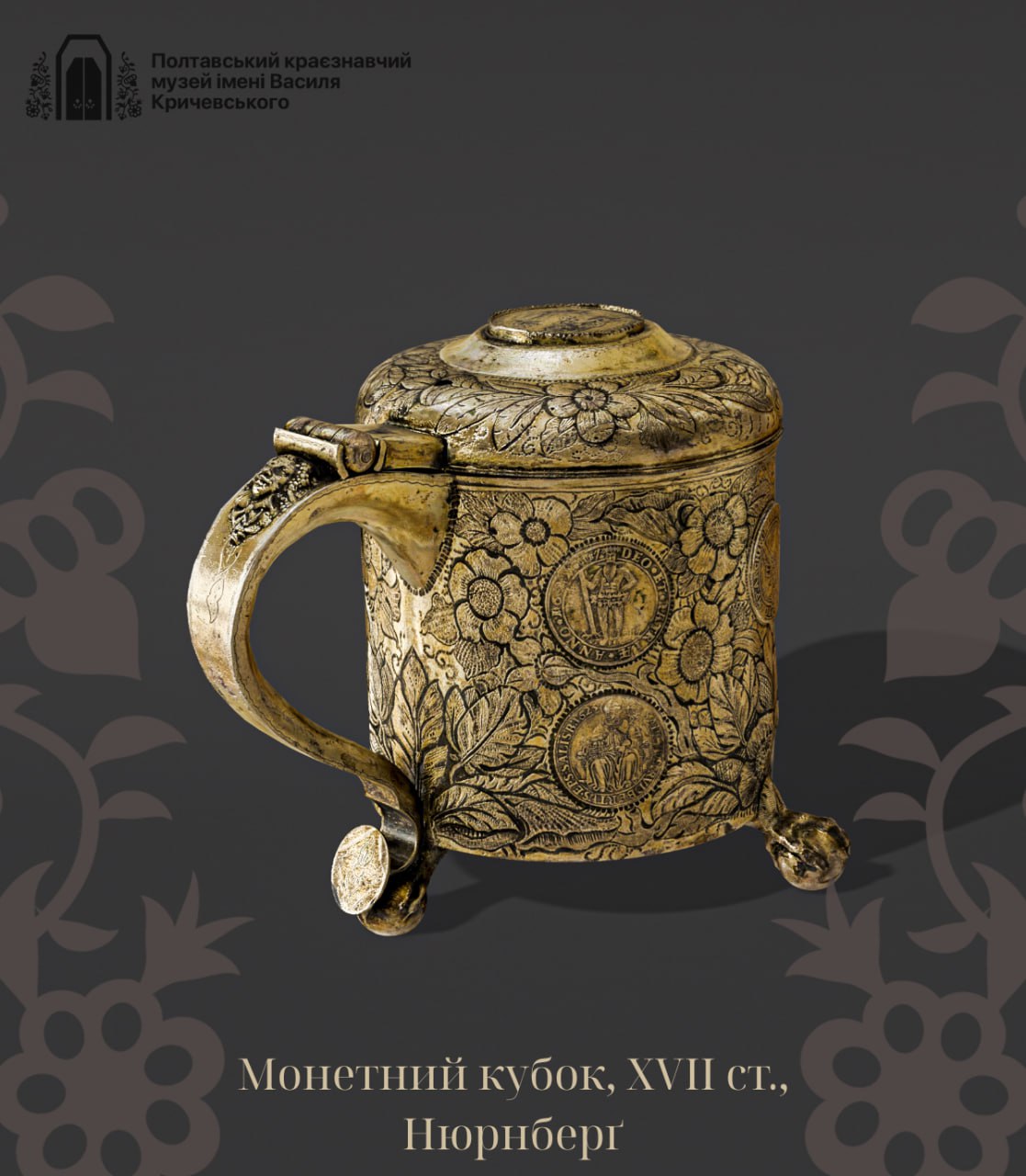 Сьогоднішня листівка — символ нашої тривалої й міцної культурної спільності з рештою європейських країн — старовинний монетний кубок роботи німецьких майстрів ХVІІ ст. Виконаний у стилі ренесансу і неоготики, він вражає довершеністю форми і оздоблення. По корпусу і кришці розміщено суцільний чеканний випуклий квітковий орнамент. З інших елементів декору відмітимо крупні монети-талери, що утворюють пояс по корпусу.