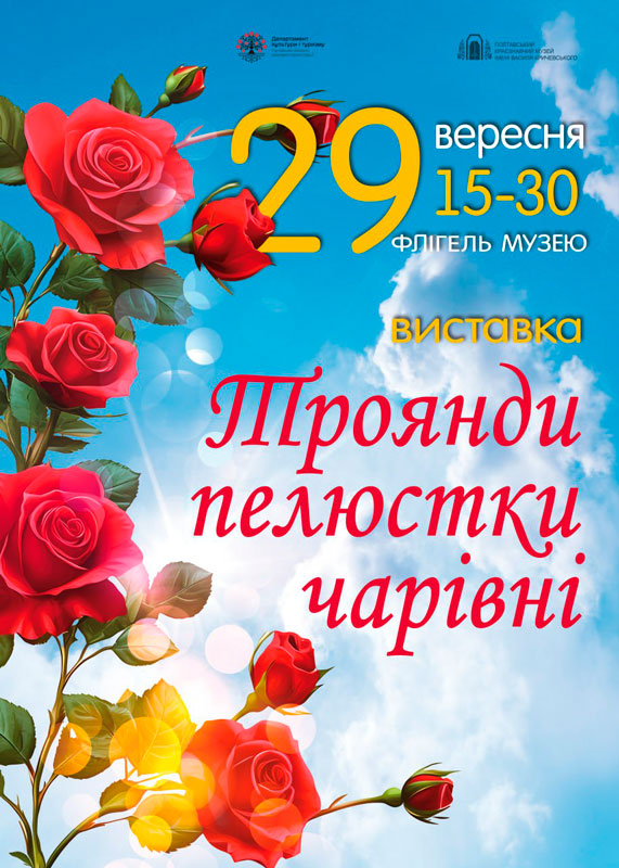 Із 29 вересня у флігелі Полтавського краєзнавчого музею імені Василя Кричевського працюватиме виставка "Троянди пелюстки чарівні" (кураторка Ганна Барська). Тут можна буде зануритися у красу королеви квітів та ознайомитися з музейними предметами й частиною приватних колекційних збірок із цієї тематики.