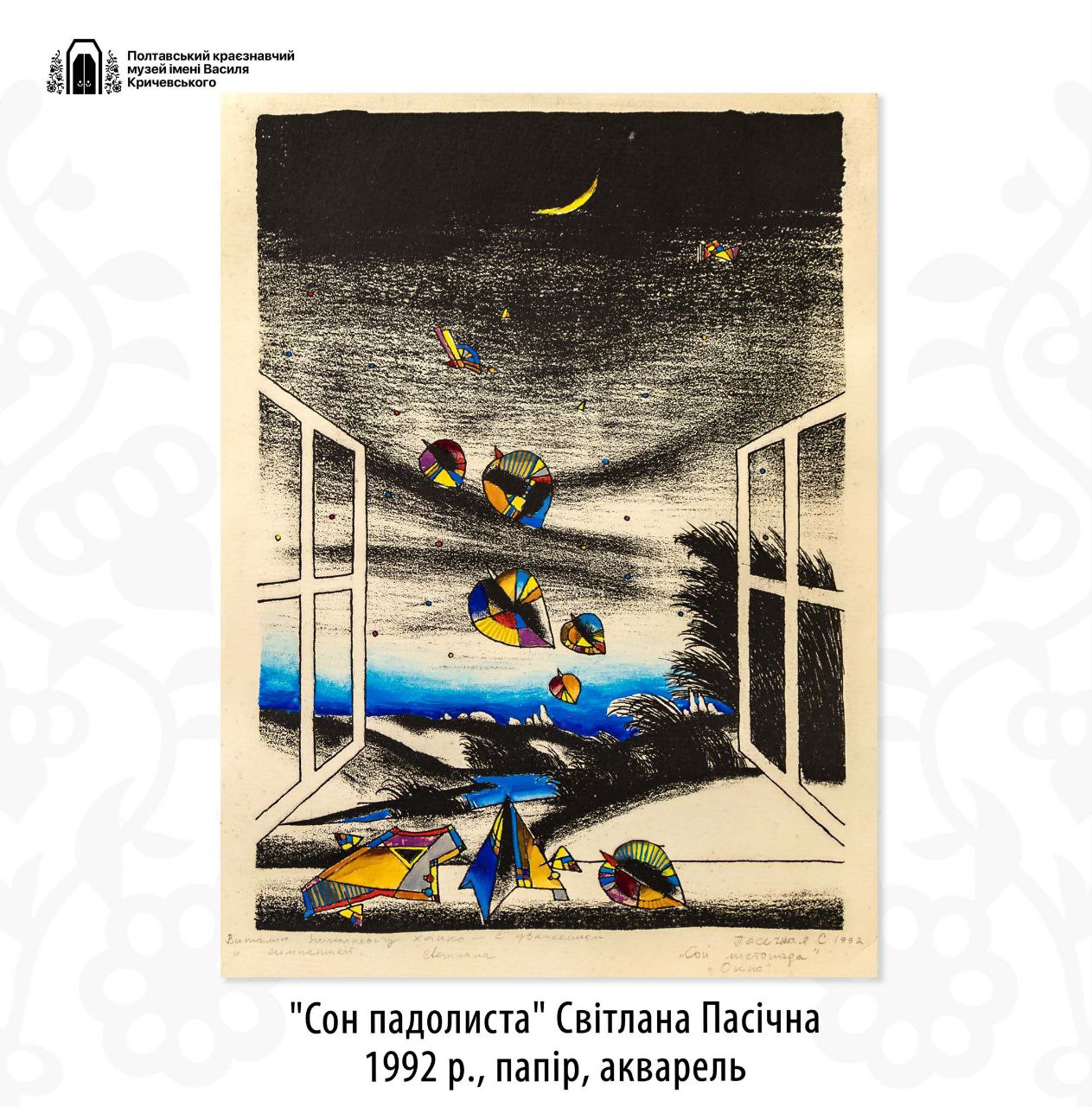 Акварельна робота «Сон падолиста» 1992 р. Із відкритого вікна відкривається вид на місячну ніч. Тонкий місячний серпанок високо в небі, а його сяйво відображається у яскраво-синій водоймі. У вікно залітає яскраве осіннє листя, оформлене у притаманній манері авторки. На роботі дарчий напис: «Віталію Миколайовичу Ханку – з повагою, симпатією. Світлана».