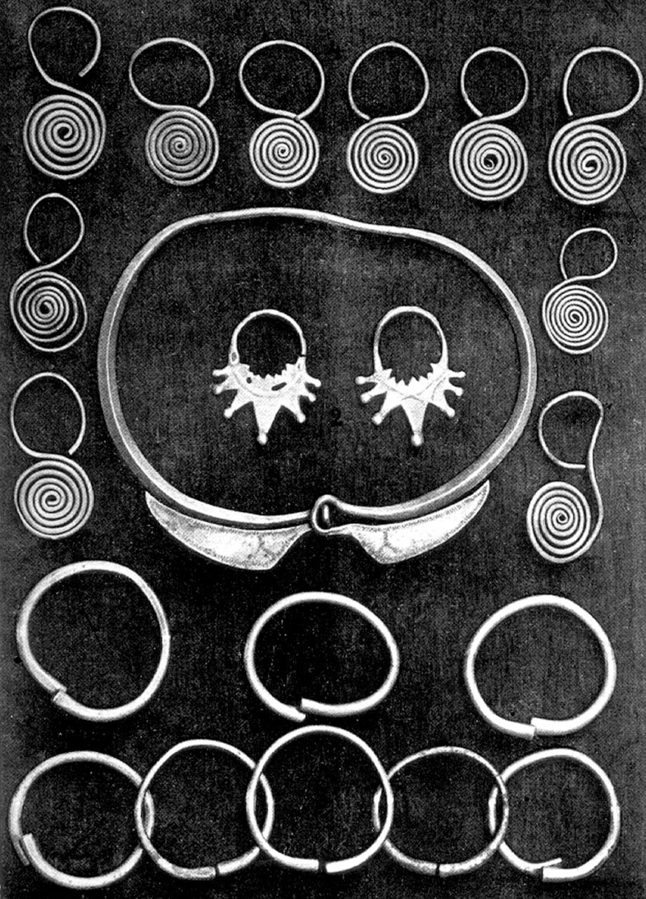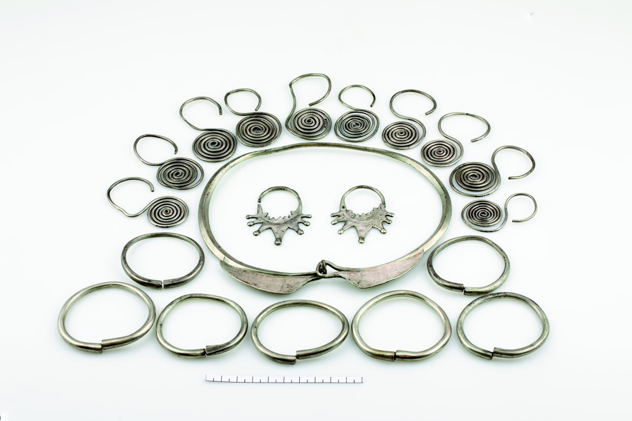 До його складу входили: масивна шийна прикраса – гривна, підвіски до головного убору – 2 семипроменевих скроневих кільця, 8 кованих браслетів і 10 спіралеподібних скроневих кілець. Шийна гривна за типом замка з подвійною петлею та розширеними розкованими орнаментованими кінцями відноситься до групи прикрас, відомих переважно на пам’ятках Роменської археологічної культури IX ст. Семипроменеві скроневі кільця – копії більш давніх по часу підвісок, мають сліди ремонту і виконані за восковими відбитками з таких же прикрас X ст. Браслети із потовщеними кінцями побутували весь час існування сіверянських старожитностей. Спіралеподібні скроневі кільця «сіверянського типу» з’явилися у Дніпровському Лівобережжі в кін. X – на поч. XI ст. і відомі з поселень і поховань XI ст. із рисами давньоруського часу.