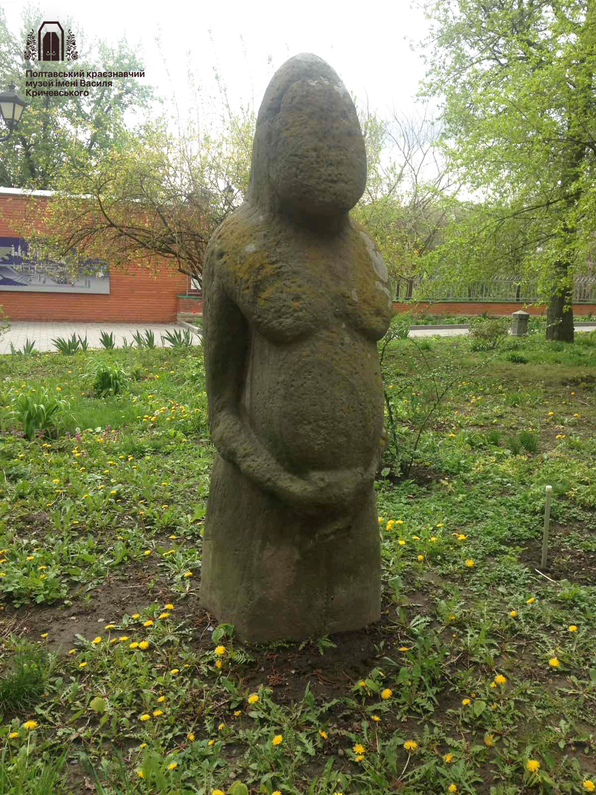 У дворику Полтавського краєзнавчого музею імені Василя Кричевського знаходиться одна із таких скульптур, що має свою історію. Це кам’яна половецька антропоморфна чоловіча скульптура великих розмірів із грубо витесаною головою, на якій простежується конічної форми шолом, а на тулубі простежуються обриси каптана. Модельовані руки, що складені внизу живота, тримають у долонях характерну циліндричну посудину-келих. Висота цієї великої скульптури – 2,4 м.Ця "кам'яна баба" відтворює, напевне, образ знатного очільника половецького роду, власника численних отар. Свого часу "баба" бовваніла в Заворсклянських степах, звідки її у другій чверті ХІХ ст. привезли для окраси ландшафтного парку князів Кочубеїв. Саме ця стародавня кам’яна скульптура прикрашала одну з алей парку родини Кочубеїв у їхньому Диканському маєтку.У 1926 році, щоб стародавній кам’яний артефакт не перетворився в будівельний матеріал хазяйновитих диканських селян, науковці Центрального пролетарського музею Полтавщини перевезли цю стелу на подвір'я музею у Полтаву, де вона "мешкає" і сьогодні.